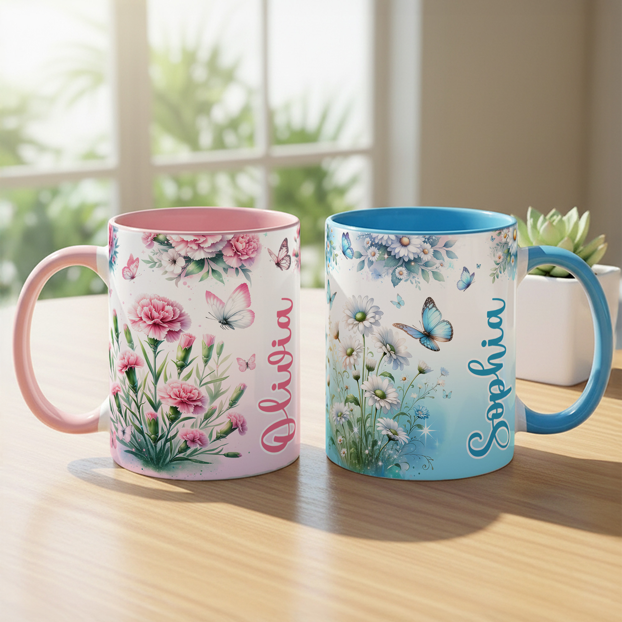 Delicate Artistry – Each mug features a hand-illustrated birth month bouquet, decorated with fluttering watercolor butterflies in translucent shades; the botanical design spreads across the ceramic with smooth gradients and fine-line details, creating a sense of springtime calm and personal significance.