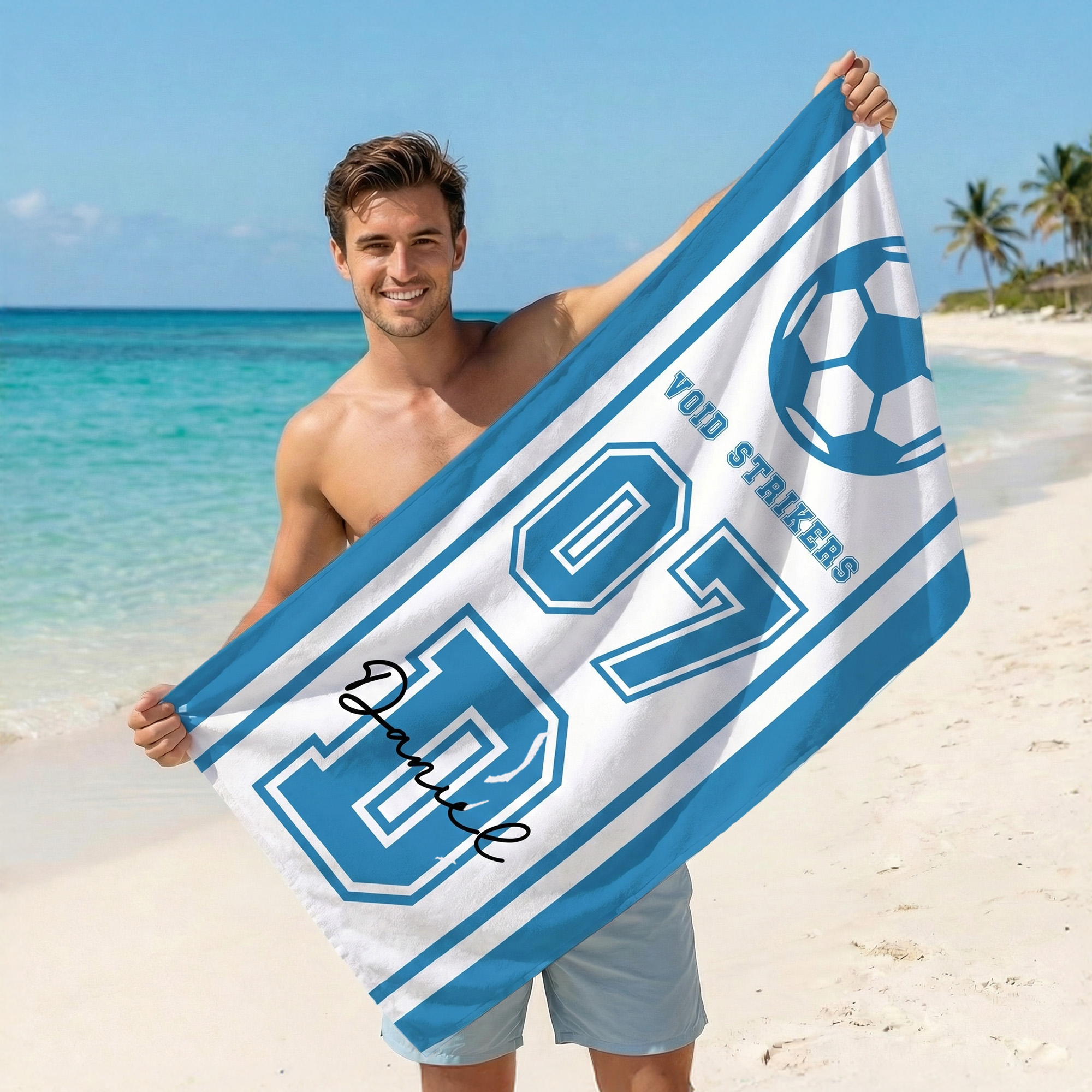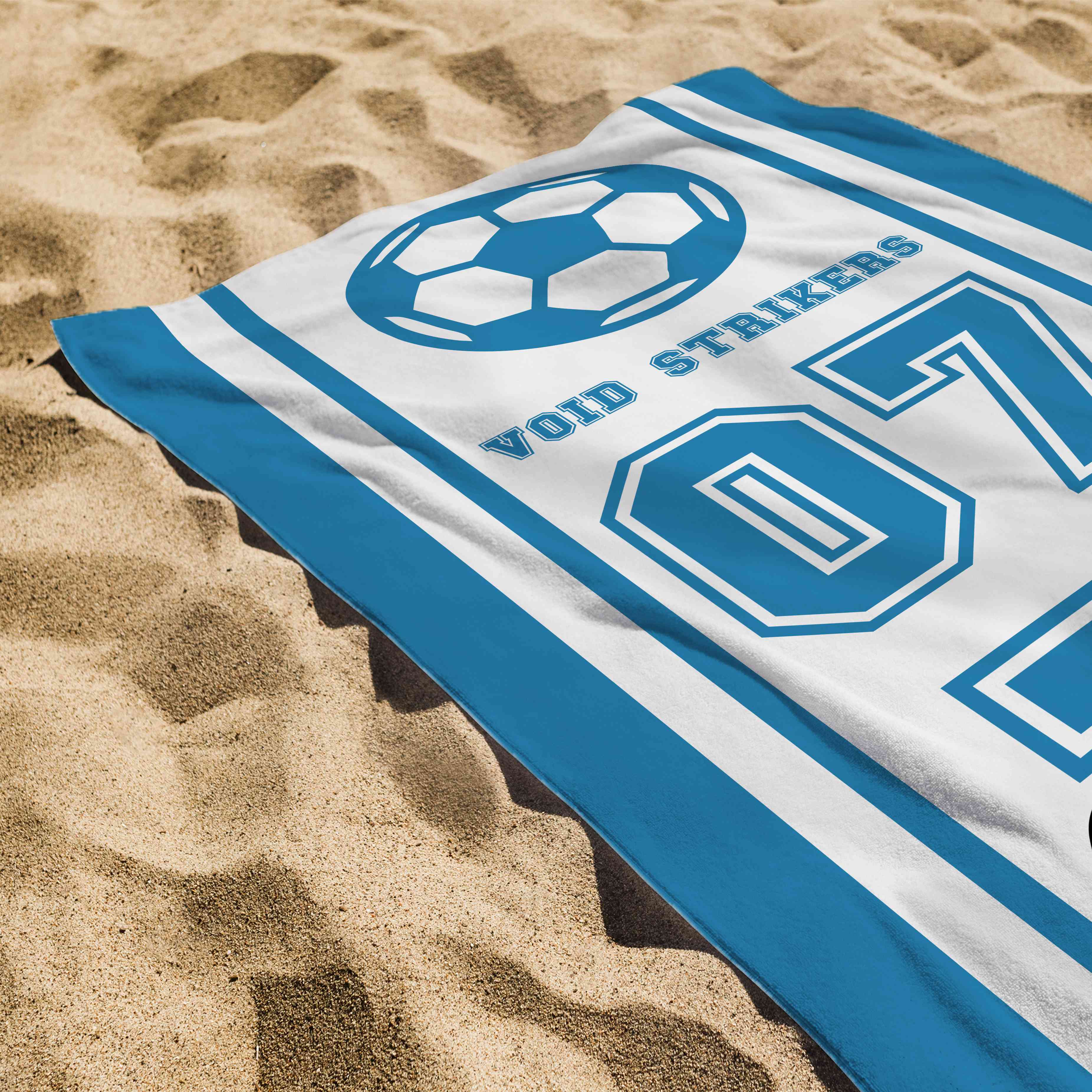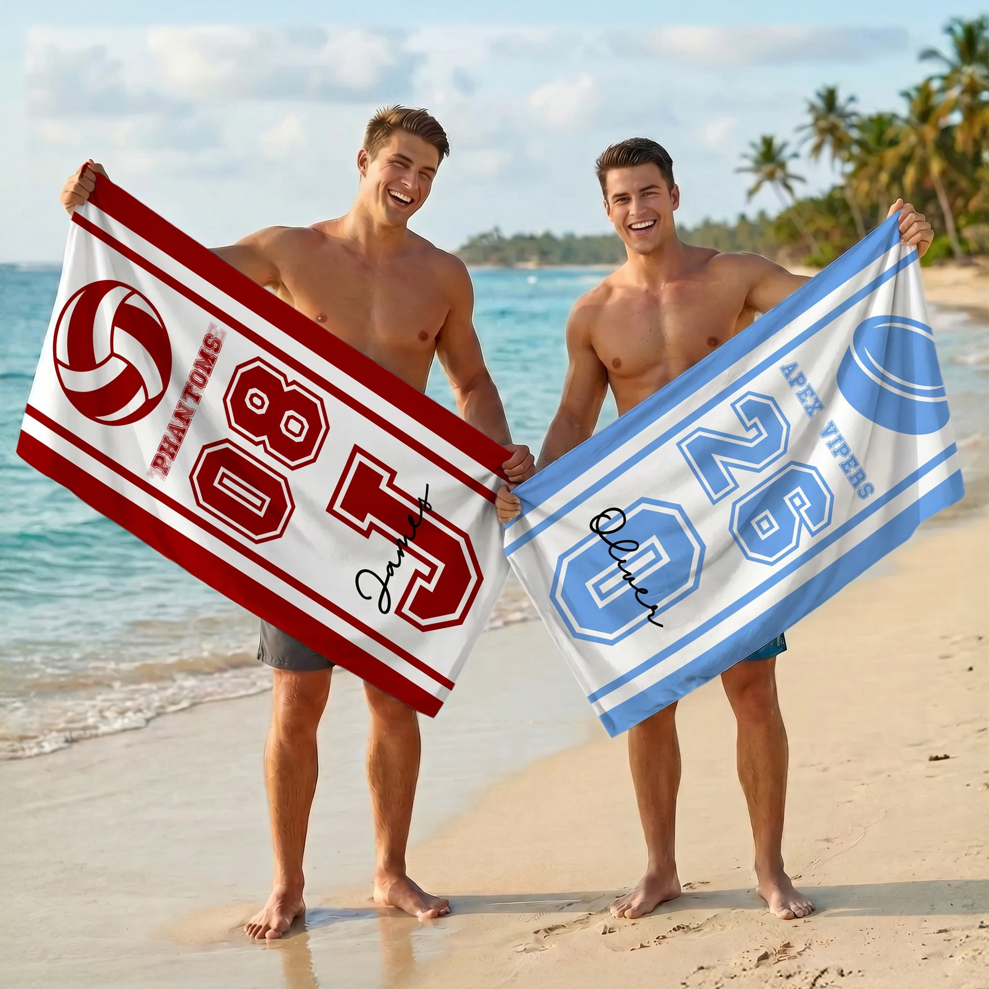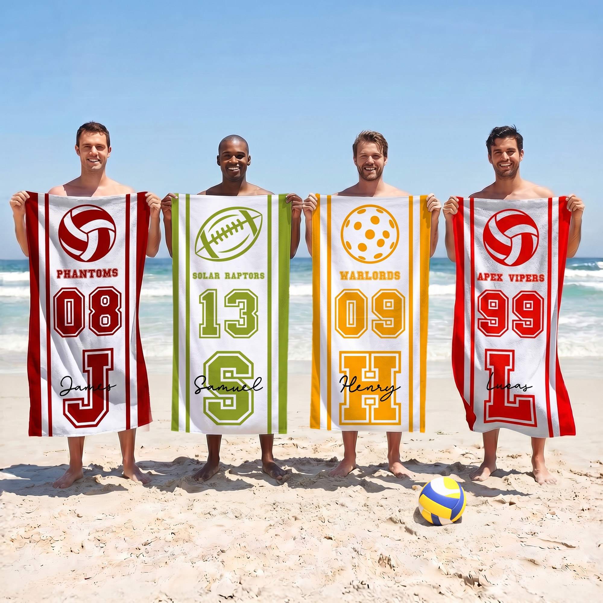 Sporty Team Spirit Design – Bold team names, dynamic sport icons, and oversized player numbers pop against crisp white or sky-blue backgrounds with vibrant colors accents; the clean layout balances athleticism and style, making it a standout statement piece for beach days or locker room pride.