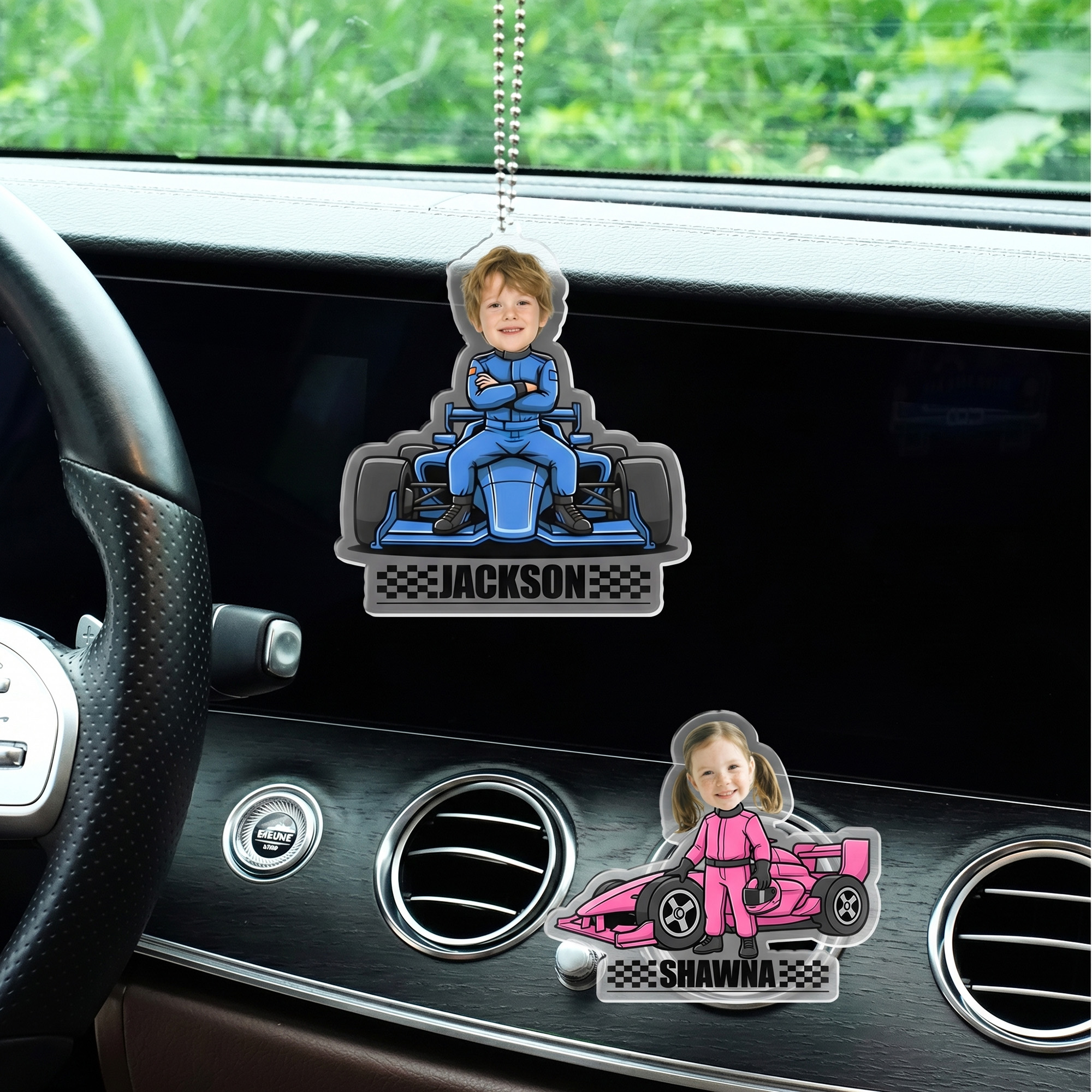 Personalized Name Face Photo Cartoon Racing Character Car Hanging Ornament/Visor Clip/Vent Clip, Auto Accessories, Birthday Gift for Racing Lovers