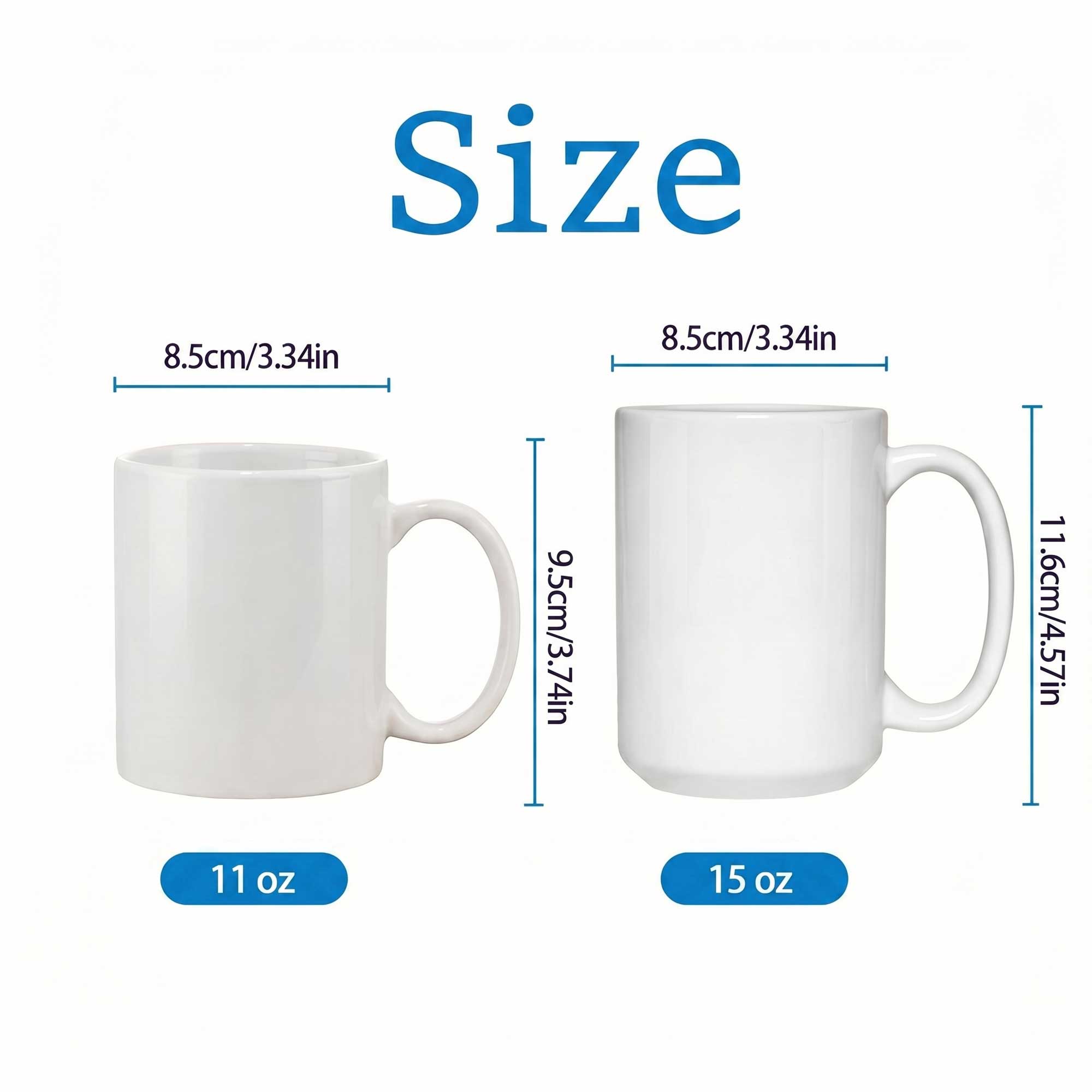 | Measurements | 11oz Mug Height: 9.5CM(3.74INCH), 15oz Mug Height: 12CM(4.72INCH) Capacity: 11oz(330ml), 15oz(450ml) |